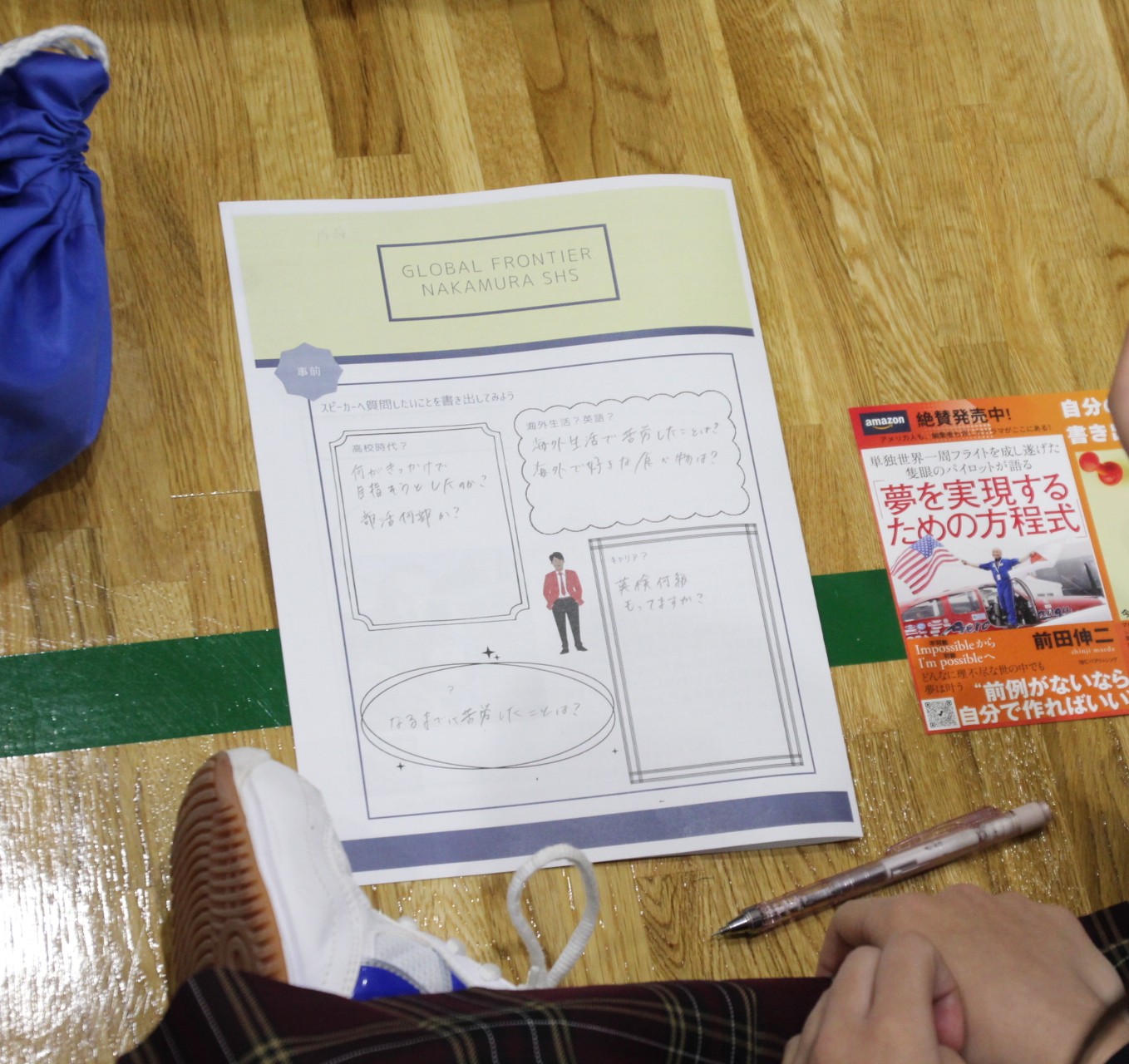 本研修に先立ち、事前学習として研修の目的や概要、前田さんのこれまでの歩みについて紹介しました。生徒たちは、前田さんの高校時代の様子や英語力、現在の夢など、講演で聞いてみたいことをワークシートに書き出しました。