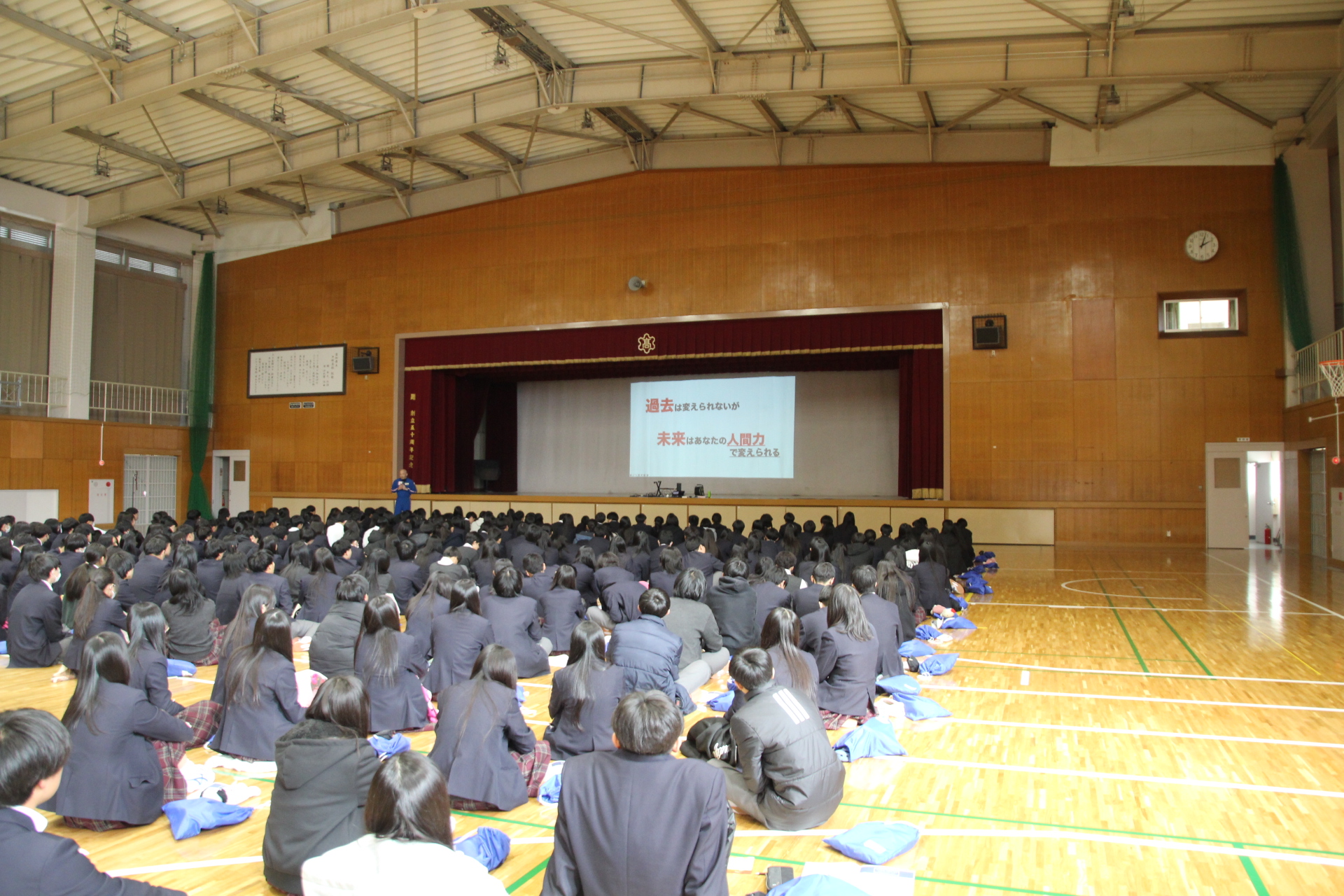 講演では、生徒を指名しながら全体を巻き込む形でお話が進められ、生徒も集中して耳を傾けていました。途中には、生徒が自身の夢を書き出し、それを声に出してみる場面もありました。生徒たちは恥ずかしそうにしながらも、自分の夢と向き合い、一生懸命考えている様子が印象的でした。また、正しい情報とは何か、国や文化によって基準が異なることもあるという話を通して、固定観念にとらわれないことの大切さや、人間力とは何かについても語られました。